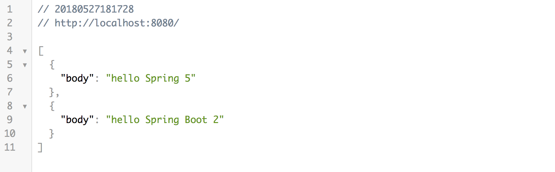2018-05-27 17:37:23.550 INFO 67749 --- [ main] s.w.r.r.m.a.RequestMappingHandlerMapping : Mapped "{[],methods=[GET]}" onto reactor.core.publisher.Flux<com.example.demo.Message> com.example.demo.MessageController.allMessages()