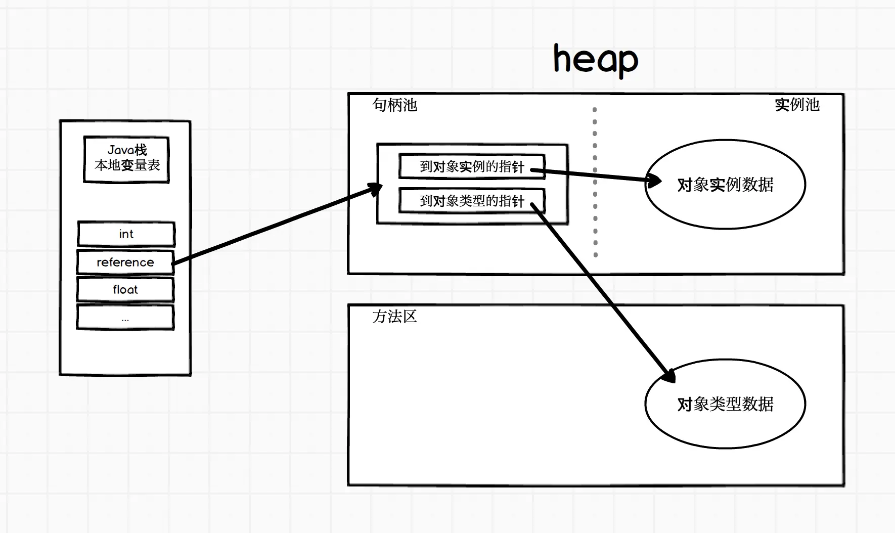 **句柄:**heap划分出一块内存作为句柄池,reference存储的是对象的句柄地址,句柄中包含对象实例数据和对象类型数据的地址信息。