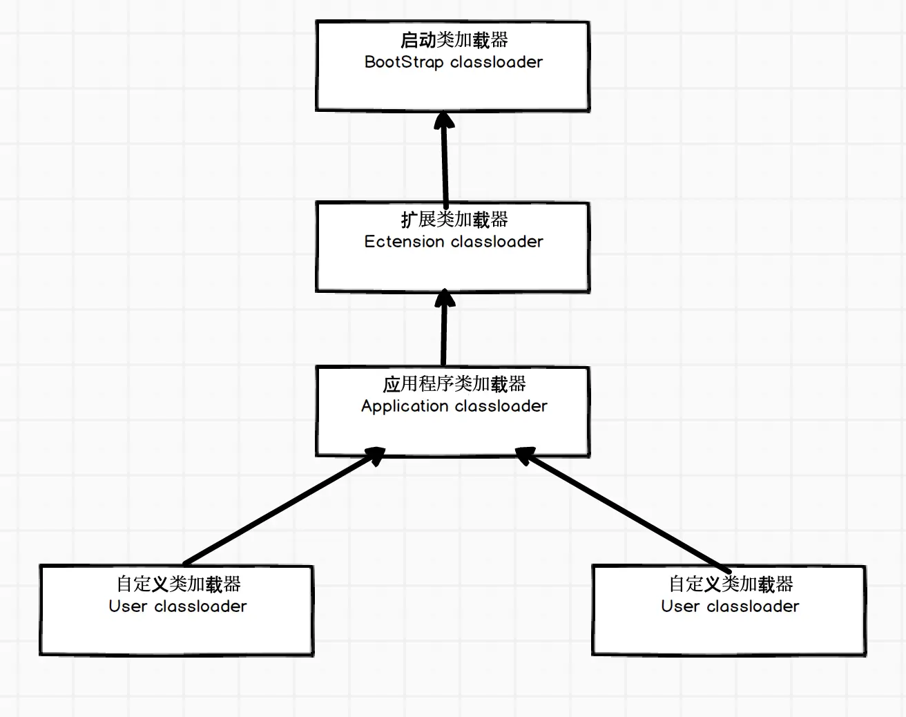 - Extension classloader 普通Java类,继承自classloader类,负责加载jre/lib/ext下的所有jar包