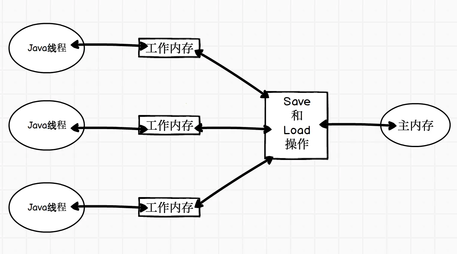 - load:作用于工作内存中的变量,把read操作从主内存得到的变量放入工作内存的变量副本中