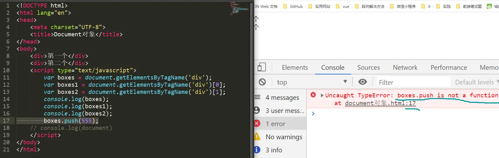 以上三个获取到的元素是以类数组的形式存储,哪怕获取到的节点只有一个也是以类数组方式存储(类数组是一个对象而不是真正的数组),因为用数组的方法push会报错(看下图)。个人理解和函数传入多个实参argument差不多。 而getElementById()则不是