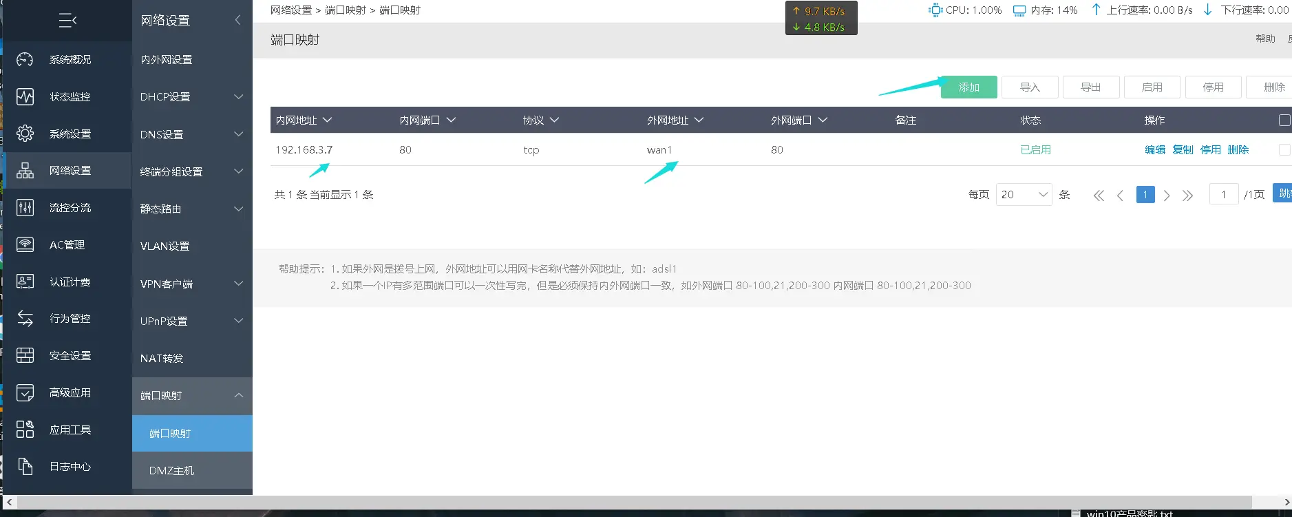 - 第一重是服务器1的80端口到ikuai的wan口的80端口,