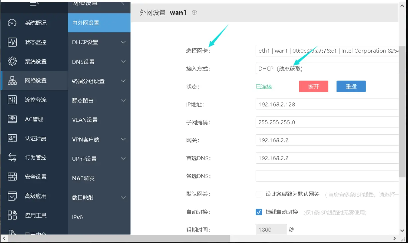 在设置wan口和lan口后,ikuai已经能够正常工作了。但是我们必须要在其他虚拟机中指定网关为lan口地址。加上dhcp服务后就能够动态分配地址了,当然我们也要把only host原来的网关的dhcp服务关掉。