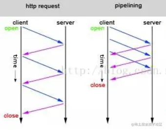 对于HTTP 1.1版本,不仅继承了HTTP 1.0的特点,且克服了诸多在HTTP 1.0上的性能问题,不仅正式规定了 Connection: Keep-Alive 的操作,而且通过 pipelining 管道技术实现一次性发送多个请求,以提高吞吐和性能,如下图(ps:在网上找的图),左图为普通长连接的的请求TCP请求过程,右图为通过 pipelining 管道技术实现的一次性发送多个请求。