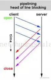 然而,pipelining管道技术有队头阻塞问题,即服务器在接收响应时,要求必须按照发送请求的顺序返回。若第一个请求被堵塞了,则后面的请求即使处理完毕了,也需要等待,如下图。
