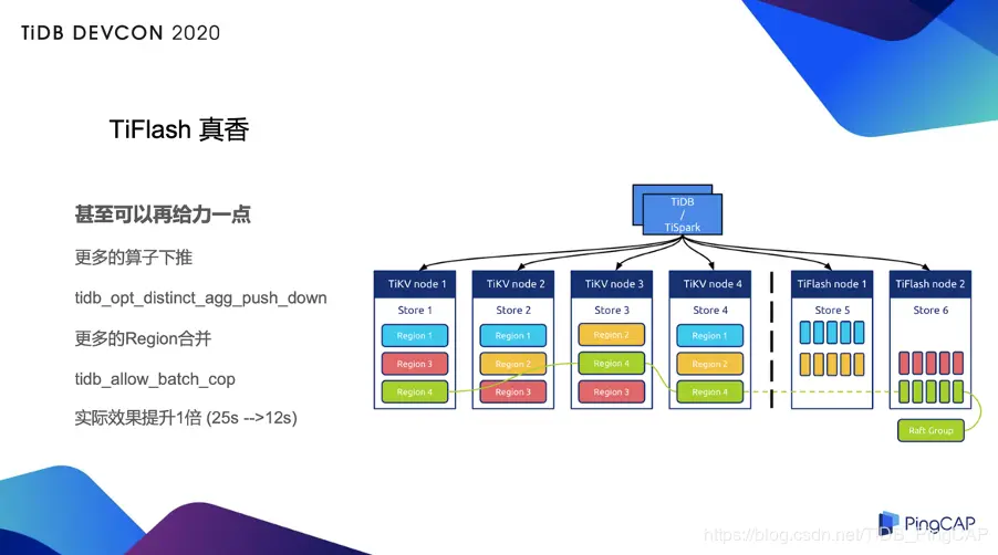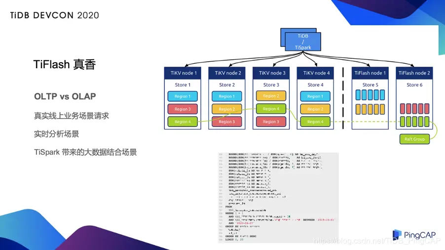 在上图的右下角,我列了一个 SQL(处理了一些敏感信息),大家可以看到这个 SQL 有 100 多行,它有一堆的表和 groupby,还有一些条件,在上面还做了 SUM 计算。这个是实时业务的请求,通常放在线上的 MySQL 上或者放在只有 TiKV 引擎的 TiDB 上,可能要跑到分钟级甚至更多。在这个业务上面我们直接勇敢尝试了 TiFlash,事实证明直接使用 TiFlash 的引擎,我们可以把这样的请求直接降到 50 秒左右,这对于业务会更加友好,并且它的数据是实时的,因为 TiFlash 的每一个 Region 都是通过 TiKV 的 Region 来进行同步,并通过 Raft 保证一致性。