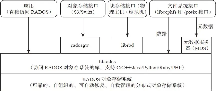 Libradio Librados是Rados提供库,因为RADOS是协议很难直接访问,因此上层的RBD、RGW和CephFS都是通过librados访问的,目前提供PHP、Ruby、Java、Python、C和C++支持。