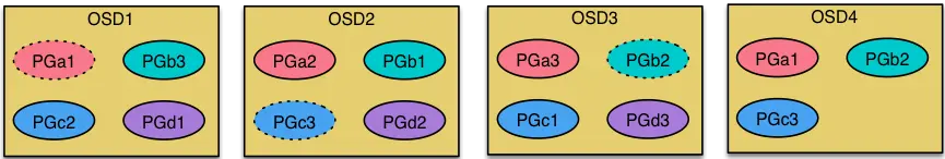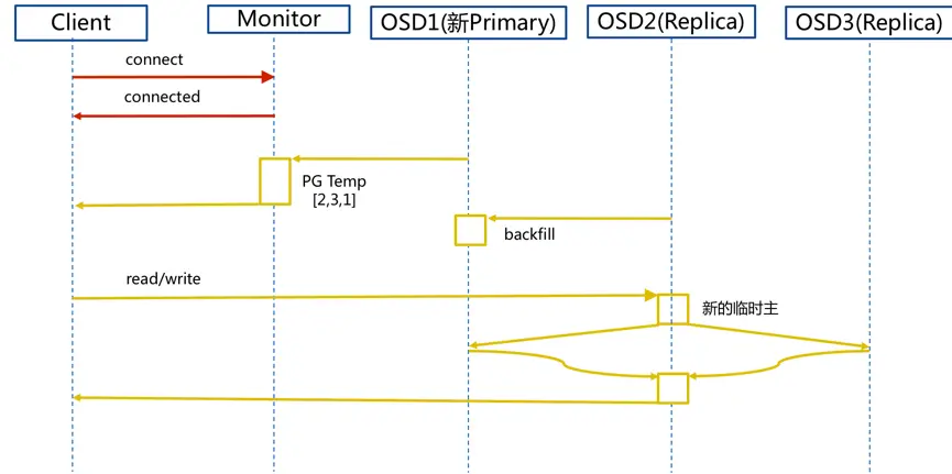 - 同时新主osd1由于没有pg数据会主动上报monitor告知让osd2临时接替为主。