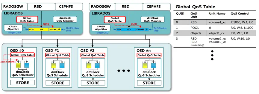 mClock是一种基于时间标签的I/O调度算法,最先被Vmware提出来的用于集中式管理的存储系统。(目前官方QOS模块属于半成品)。
