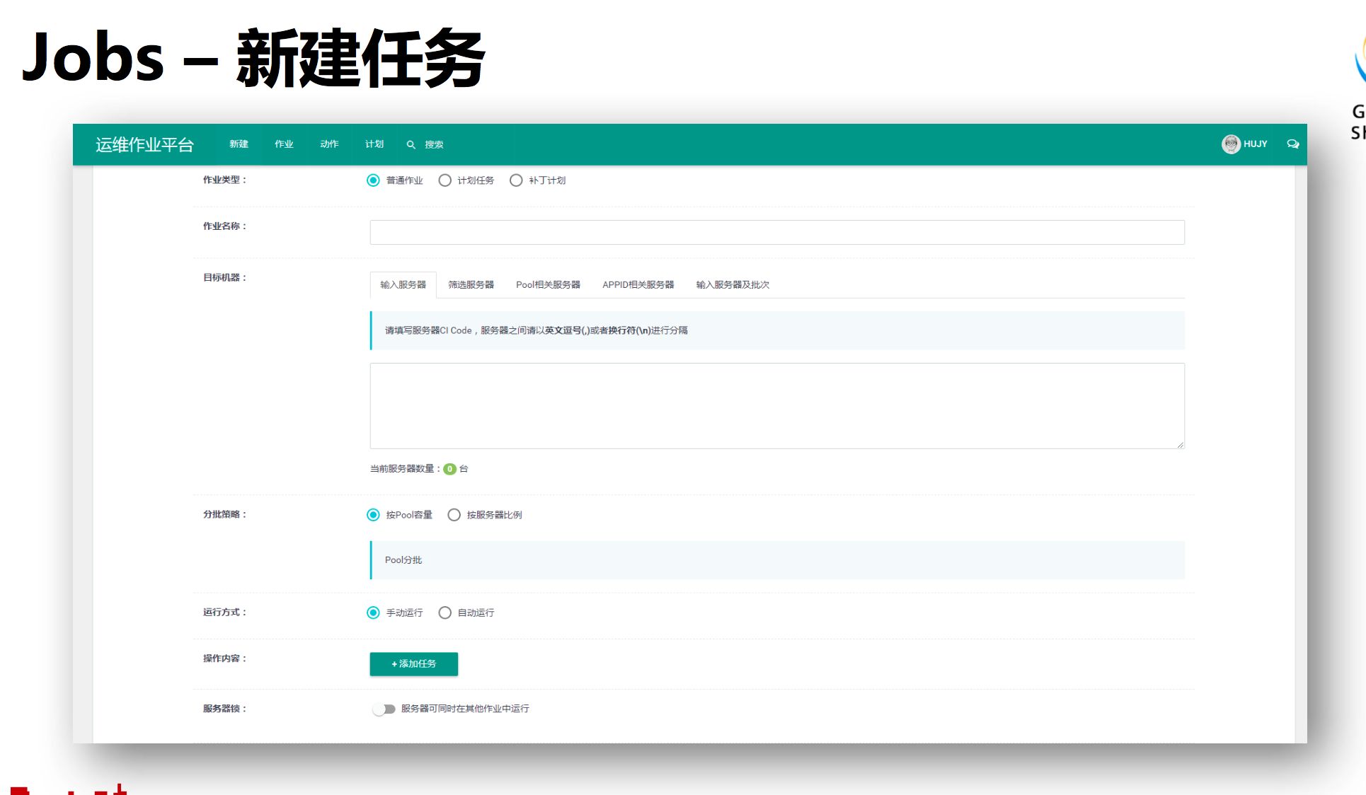 上图就是 JOBS 系统的新建任务界面,有分批策略、筛选服务器等等。