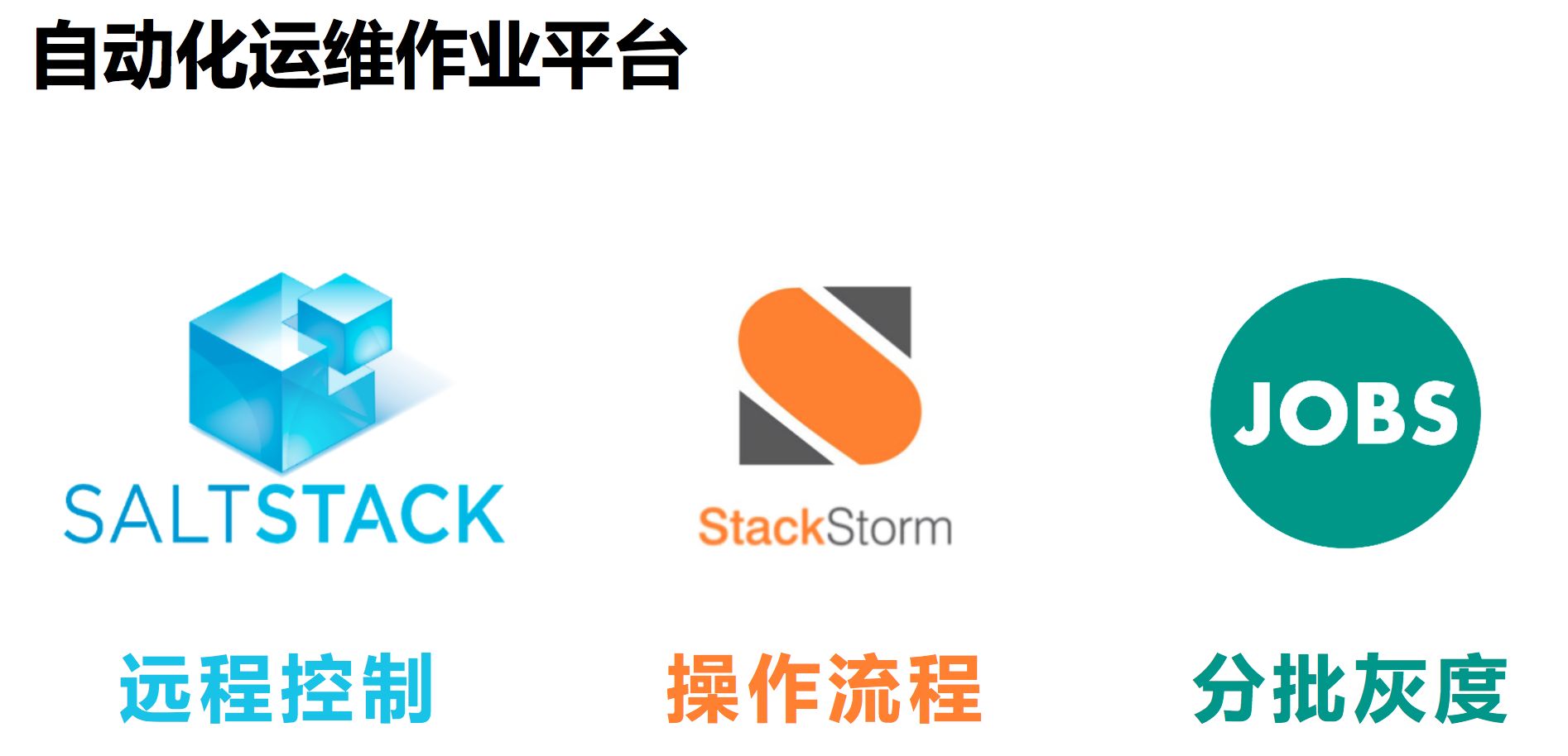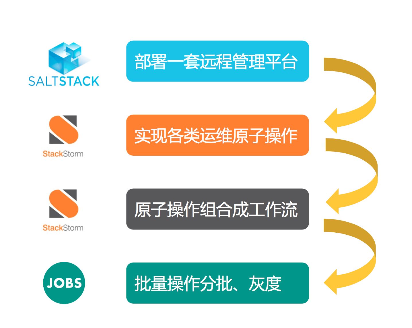 如果想搭建一套运维自动化的平台,首先部署一套远程管理框架,可以是 saltstack 或者 ansible 等,然后在 StackStorm 上实现日常的运维原子操作,再根据具体的操作需求,将原子操作组合成工作流,最后,对于大批量服务器运维任务,可以考虑开发一套具有分批灰度功能的系统,完成自动化操作。