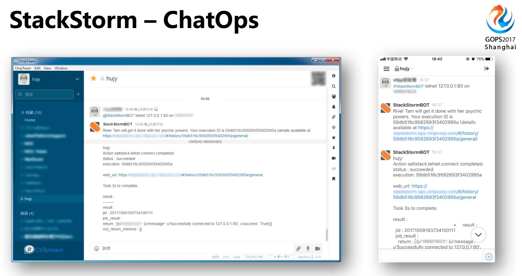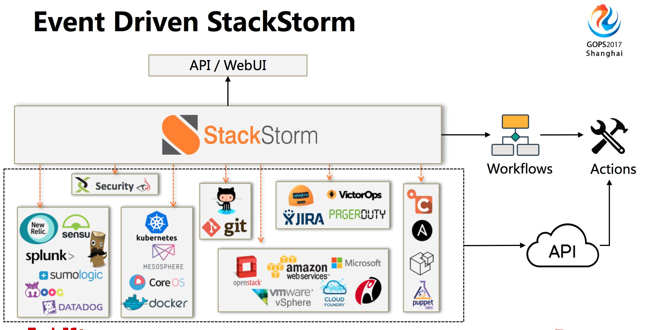 StackStorm 可以与 ChatOps 结合,进行日常运维操作,比如你正在参加 GOPS,StackStorm 将报警和初步分析发给你,你通过手机在 Chat Room 下发指令给 StackStorm,快速进行故障修复。