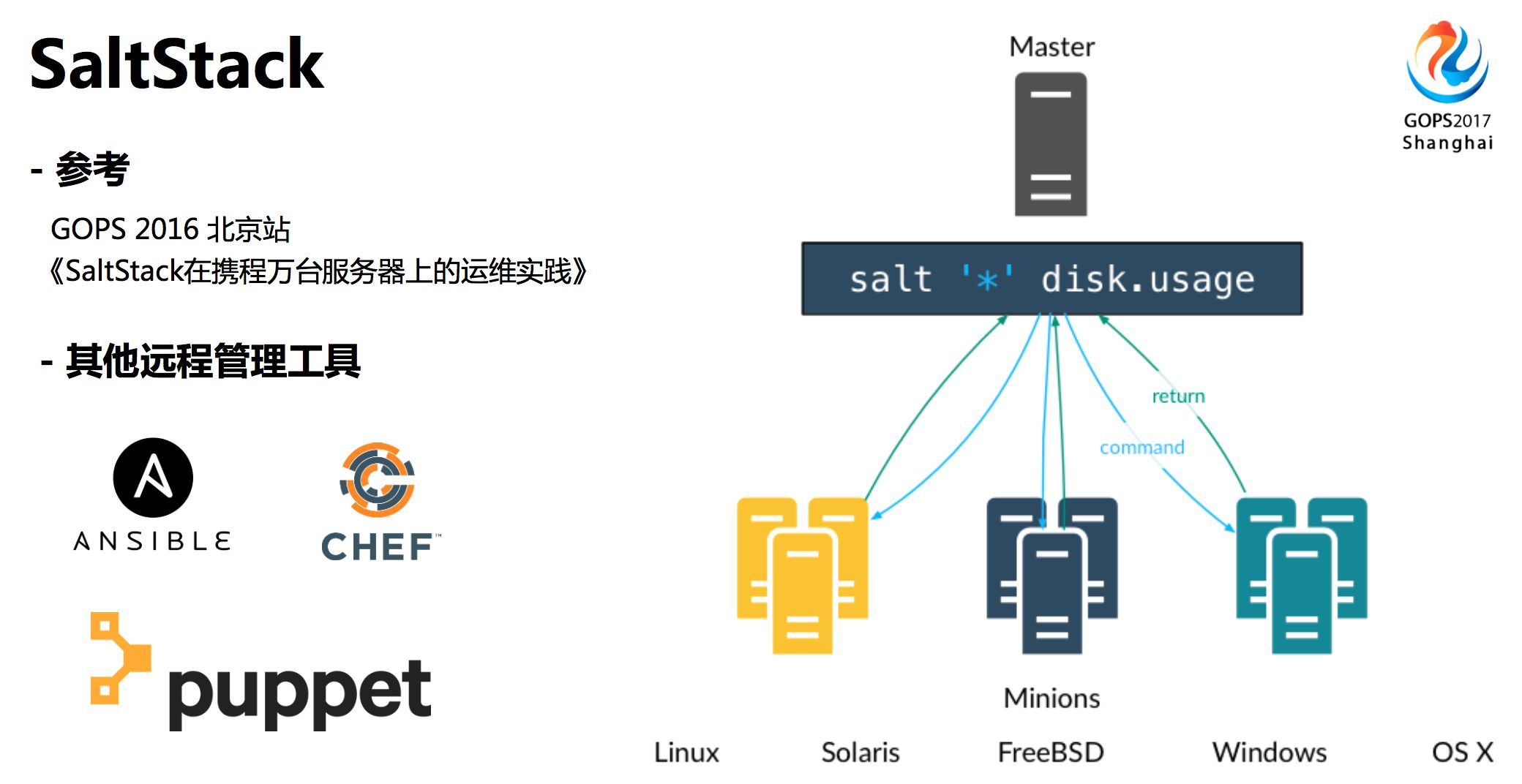 类似的远程管理工具还有 ansible、chef、puppet,大家可以根据实际应用场景选择。我去年在 GOPS 北京站分享过携程在使用 SaltStack 的一些经验,大家可以参考,这里就不再赘述。