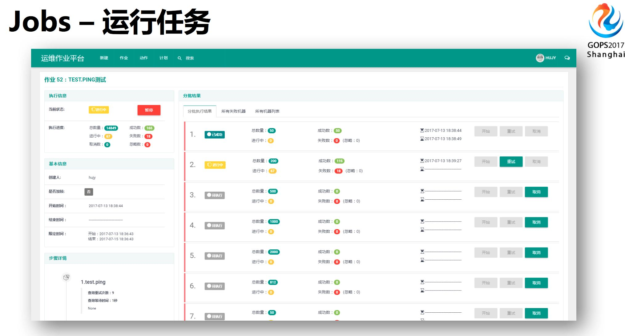这个是 Jobs 任务详情页。左边是任务信息,右边是具体的分批的情况。分批运行任务,即使任务运行造成了故障,可以及时发现及时停止,控制影响范围。