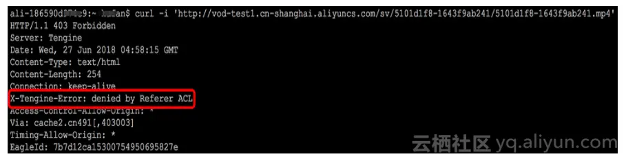curl -i 'http://vod-test1.cn-shanghai.aliyuncs.com/sv/5101d1f8-1643f9ab241/5101d1f8-1643f9ab241.mp4' \ -H 'Referer: http://www.aliyun.com'2.2 UA黑白名单