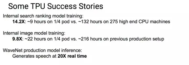 第二代 TPU 就面向训练开发。Jeff 在多次演讲中提到了一些 TPU v2 的成功应用案例,包括用四分之一个 pod 把谷歌的搜索排序模型的训练提速到 14.2 倍,把处理图片的模型训练提速到 9.8 倍等。
