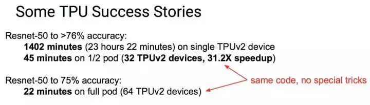 而且,TPUv2 具有几乎是线性的扩展性,64 块 TPU 可以组成一个 TPU pod,提供最高 11.5 PFLOPS 的算力。用一块 TPUv2 把 ResNet-50 训练到 76% 准确度需要 1402 分钟,用二分之一个 pod(32 块 TPUv2)只需要 45 分钟(31.2 倍速)。