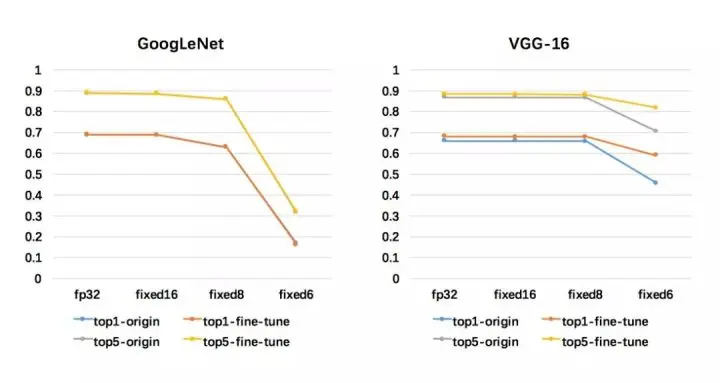 现在常见的做法是,在训练阶段采用浮点数,而在推理中采用定点数。例如在 TPU 的例子中,所有的推理只采用 8 比特定点数表达。其实现原理是在完成训练后,根据各层的参数和激活部分的最大值和最小值,找到表达其整数部分所需的最小比特数,用此表示,然后用 8 比特中剩下的部分表示其小数点后部分。实证研究显示,将精度从 32 比特降低到 8 比特,只会少量影响 GoogLeNet 和 VGG-16 的表现,但是如果继续下降到 6 比特,模型效果就会受到显著影响。