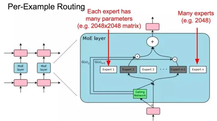 谷歌在 ICLR2017 的一篇论文上就提出了一个叫做混合专家层(MoE)的概念。每一个「专家」相当于神经网络中的一小撮参数,只不过比普通神经网络里的参数更容易训练,而一层由超过 2000 个专家组成。
