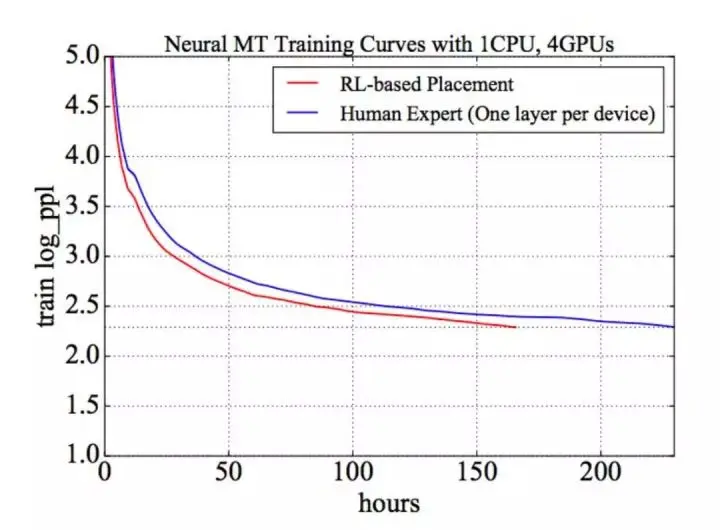 因此,将一种特定配置的收敛时间的期望作为奖励信号来将各运算分配到不同设备上,就变成了一个有吸引力的解决方案。算法学到了并不符合人类直觉的配置,但比专家设计出来的方案快 27.8%,节约近 65 个小时。