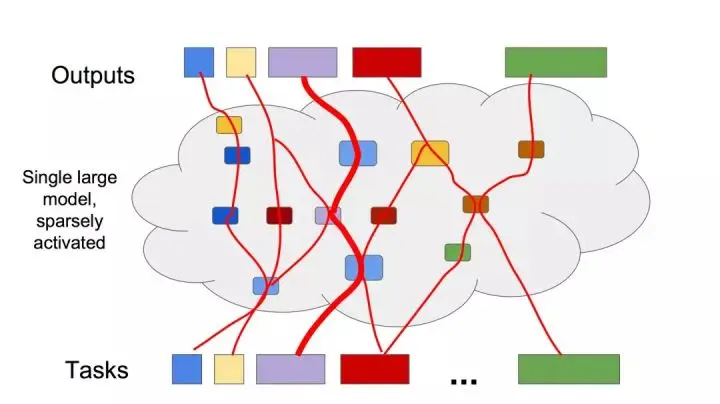 大模型是好的,因为巨大的参数量意味着我们可以记住数据集方方面面的特性。但是如果我们在处理每一个数据的时候都需要激活整个模型,这意味着巨大的计算成本。因此,最理想的状态是拥有一个可以分割成众多独立的小部分的庞大模型,每一部分都承担不同分工,当数据进入模型时,模型按任务需求激活少数几个部,让大部分保持闲置状态。这样的特性又可以称作「粗粒度稀疏性」。