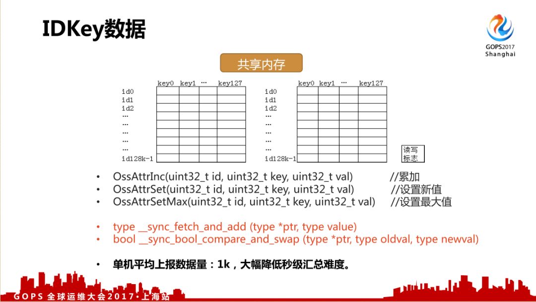 我们重点说一下IDKey数据。这个IDKey数据是早期的重点监控数据,但其上报量占了数据上报的9成以上,像刚才所说,用文本型数据上报难以做到稳定、快速,所以我们定制了一个非常简化、快速的上报方式,直接在内存进行快速汇总,具体上报方案可以看下面这个图。