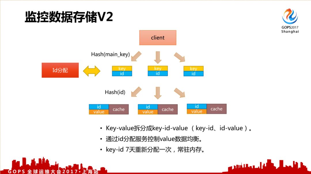 第二个改进的方法是把 Key-Value 拆分成 key-id-value ,通过id分配服务控制 value 数据均衡,key-id 7天重新分配一次,减少内存占用。