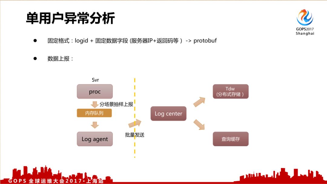 采用固定的格式: logid + 固定数据字段(服务器IP+返回码等),数据上报量比刚才的非实时日志还要大很多,所以我们是抽样上报的,除了把数据存入到Tdw分布式存储里面,还会把它转发到另外一个缓存里面进行一个查询缓存。
