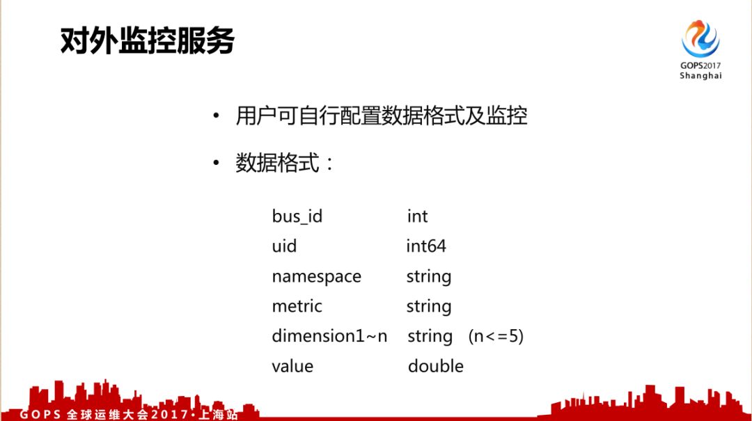 下面简单介绍一下我们最新的对外监控服务,这个方案参考了一些云监控的方案,用户可以自行配置维度信息和配置监控规则。