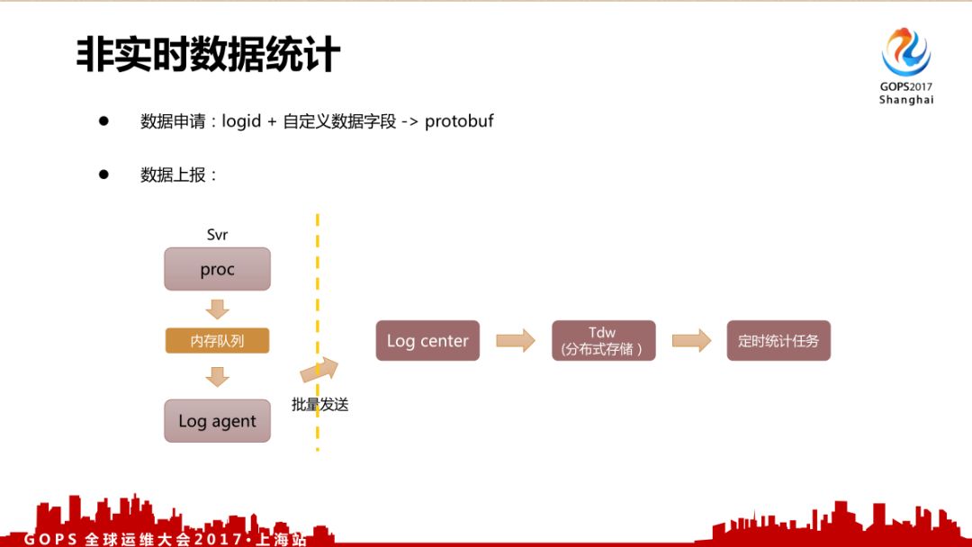用户在上报的时候会先申请 logid + 自定义数据字段,上报并非使用写日志文件的方式,而是采用共享内存队列、批量打包发送的方式减少磁盘IO、日志服务器的调用压力。统计使用分布式统计,目前已经是常规做法。