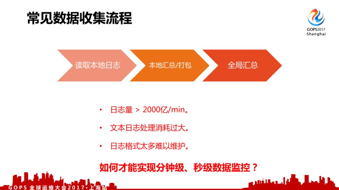 先看一下常见数据收集流程,一般常见的采集流程来说从日志里面采集,然后本地汇总打包,再发到全局服务器里面汇总。