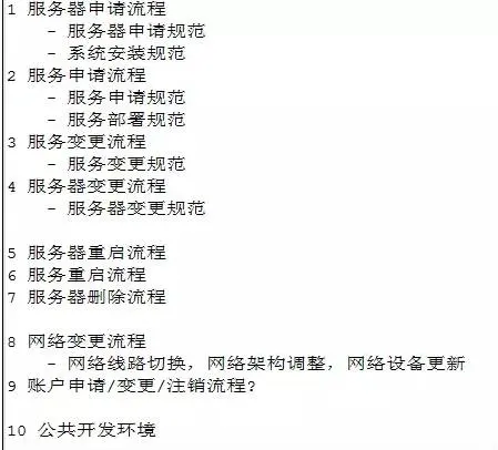 文档库主要用来存储运维管理过程中执行的运维标准和规范以及运维的流程规范,常用的一些规范举例: