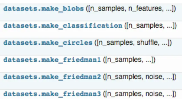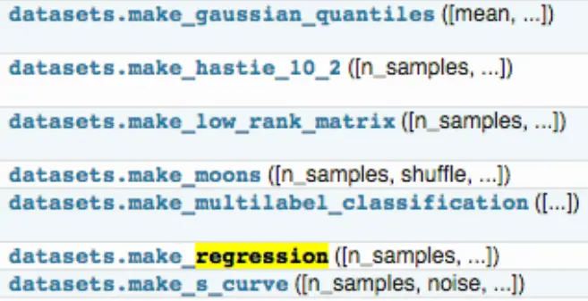 你除了可以使用sklearn自带的数据集,还可以自己去创建训练样本,具体用法参见《Dataset loading utilities》,这里我们简单介绍一些,sklearn中的samples generator包含的大量创建样本数据的方法: