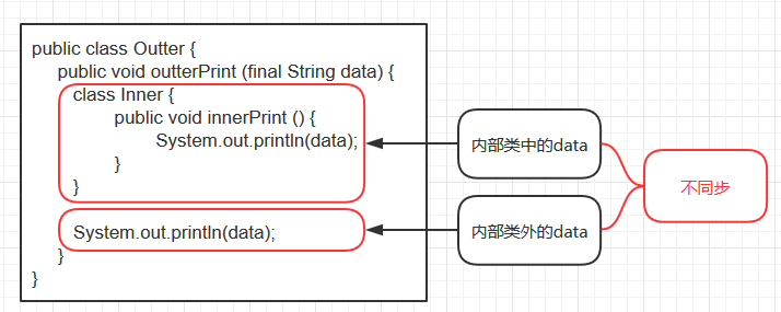 这里要注意的是: 1. 编译后,LocalInner并非直接使用data,而是用构造器拷贝一份后再使用 2. java是值传递的,所以包裹 LocalInner的外部方法outterPrint也会对传入的data参数做一次拷贝(基本类型数据拷贝副本,对象等则拷贝引用) OK,现在的情况是: 方法内的局部类对data拷贝了两次:外部方法outterPrint值传递时的拷贝,和LocalInner构造函数的拷贝 方法内除了局部类外的作用域只拷贝了data一次: 外部方法outterPrint值传递时的拷贝 拷贝两次和拷贝一次,导致在outterPrint方法内部, 局部类内部的data和局部类外部的data是不同步的! 也即你在局部类内部改了data不影响局部类外部的data,在局部类外部改了data也不影响局部类内部的data(注意一个前提,值是基本类型的,如果是对象的话因为拷贝的是引用仍然可以“同步”) 图示一: