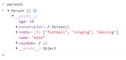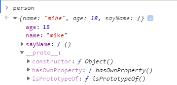 这里打印 person 对象,可以看到有 2 个属性和 1 个方法,原型对象是 Obejct,constructor 属性(指向构造函数的指针)指向 Object 对象。