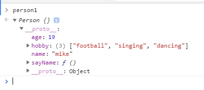 下图可见通过原型模式解决了构造函数模式多次创建了 sayName 方法的问题,但聪明的电视机前的你肯定发现了定义的原型属性会被所有的实例共享。