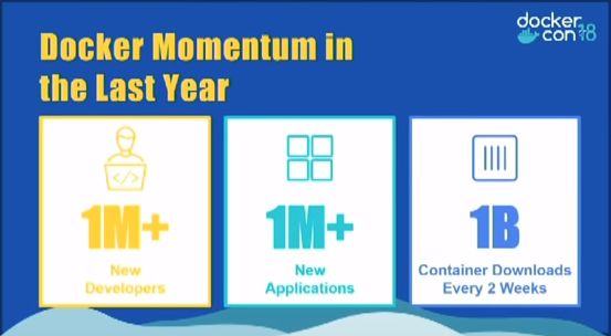 2017年统计数据:Docker生态体系上,新增了100万开发者、100万新增基于Docker应用、以及每两周10亿次的应用下载量。