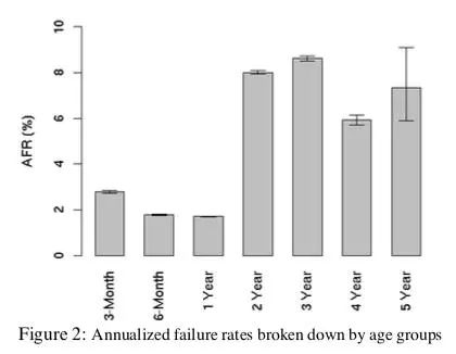谷歌论文的统计对象,都是使用5年以内的磁盘。磁盘的原厂保修期一般也都是5年。这个寿命选择来源于磁盘故障率的U型分布规律。