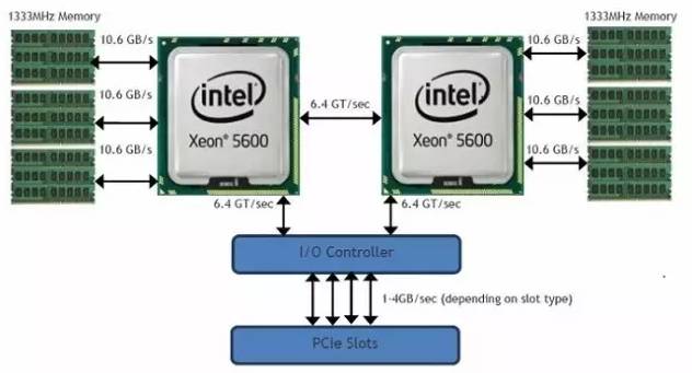 至于如何找出硬件是性能瓶颈我们先在这里不细说,在后面的文章中我们将会细说。最后我们来看一张硬件架构图,能帮你更好的理解硬件优化,如下图(Dell R 710 架构):