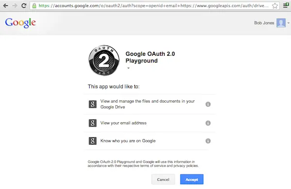 - 接下来就要向 Google 请求 access token。这里我们先忽略一些细节,例如请求参数(当然需要上面申请到的 secret)以及不同类型的程序的请求方式等。重要的是,如果你想访问的是用户资源,这里就会提醒用户进行授权。