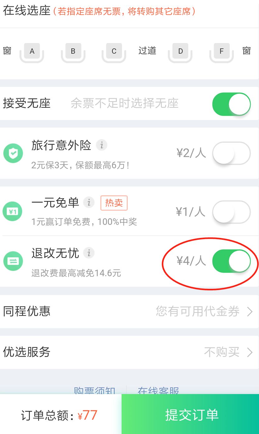 比如说订个火车票,会默认勾选一些东西。