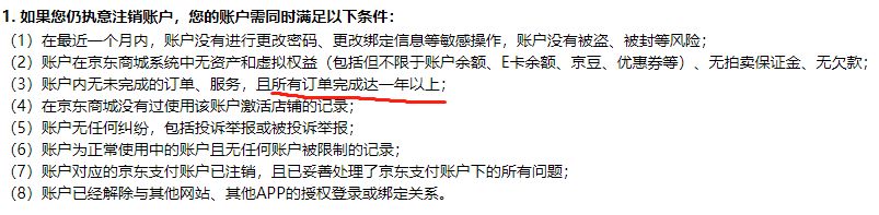 这时候会跳出一个条款,需要满足一些条件才能成功注销,毕竟不能让有的用户打了白条还注销跑路对吧。。。但有一条很有意思:所有订单完成达一年以上。