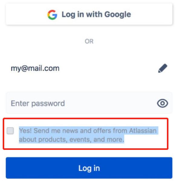 再比如一家叫做 Atlassian 的网站,输完账号密码以后,在密码栏下方,登陆按钮上方的位置,是一个勾选以后会发送订阅邮件的选项。