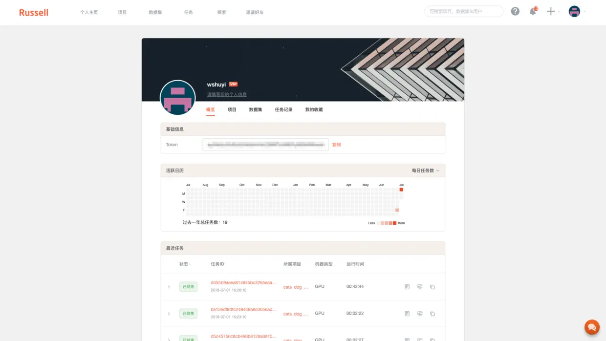 与 FloydHub 不同,大多数情况下 Russell Cloud 的身份与项目验证,用的都是这种 Token 的方式。