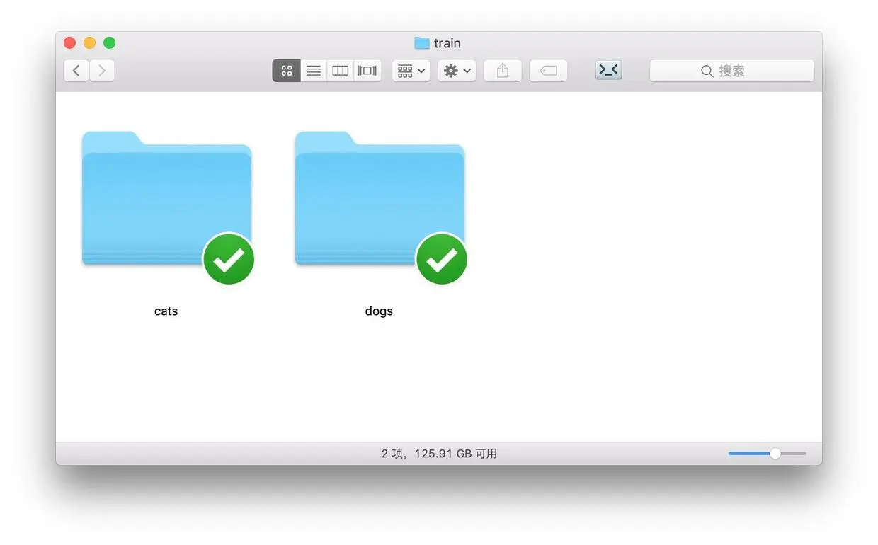 打开训练集合 train ,下面包含两个目录,分别是“猫”和“狗”。