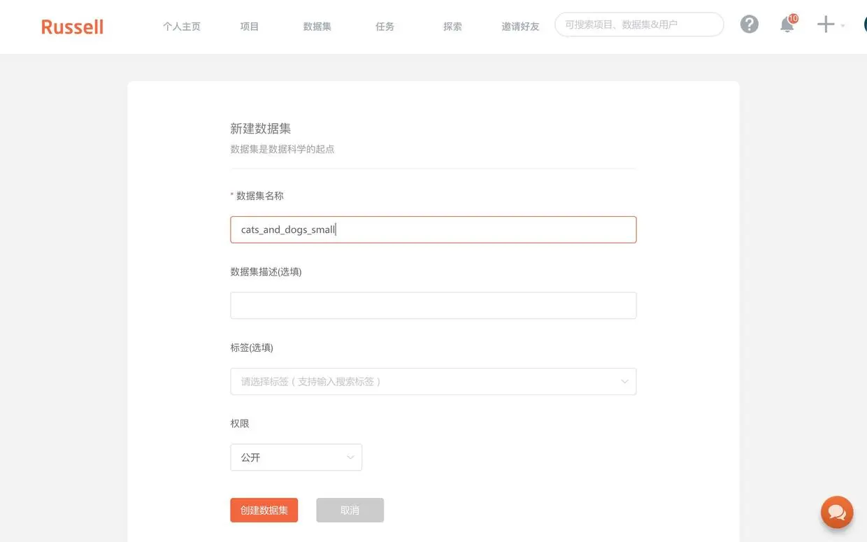请你先在 Russell Cloud 上建立自己的第一个数据集。