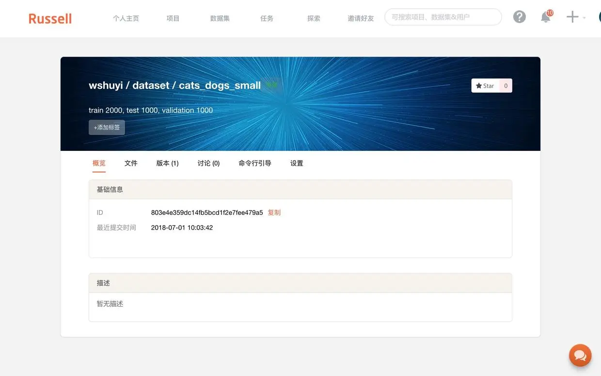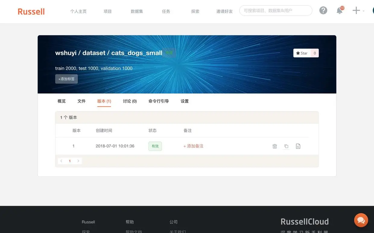 上传成功后,回到 Russell Cloud 的数据集页面,你可以看到“版本”标签页下面,出现了1个新生成的版本。