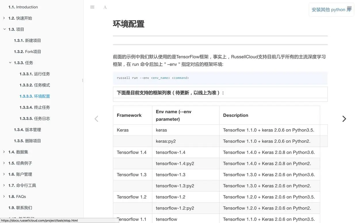 本文写作时 Tensorflow 稳定版本已经是 1.8 版,而 Russell Cloud 最高支持的版本依然只有 1.6。文档里面的最高版本,更是还停留在 1.4。默认的 Keras,居然用的还是 Python 3.5 + Tensorflow 1.1。