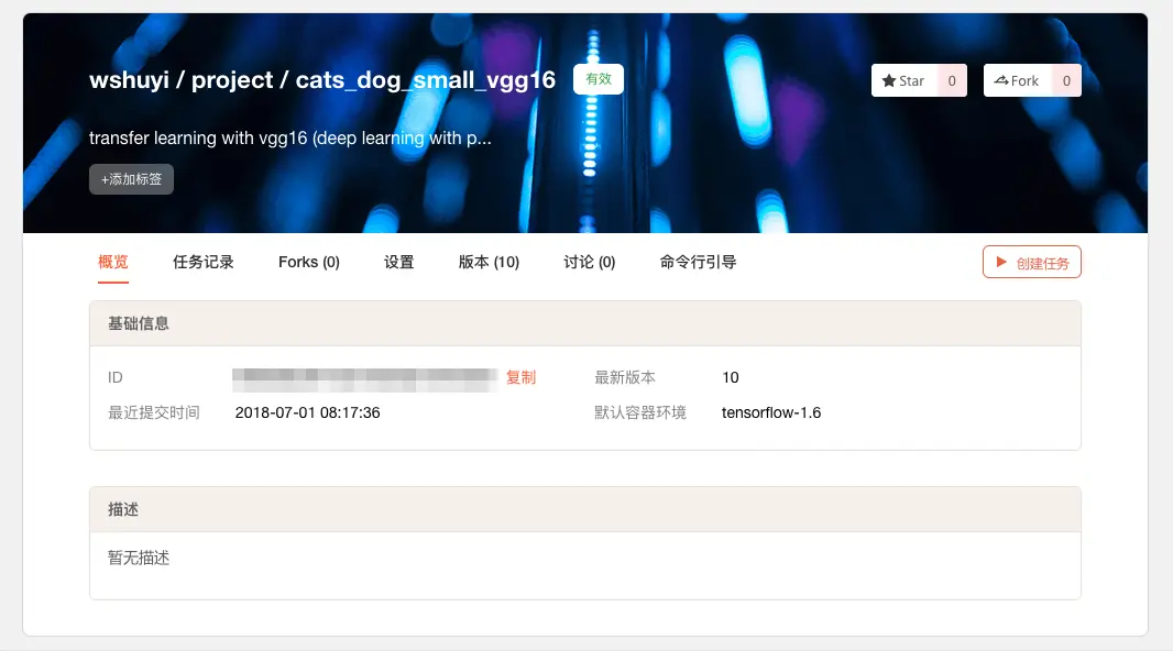 run后面的引号包括部分,是实际执行的命令;gpu是告诉 Russell Cloud,你选择 GPU 运行环境,而不是 CPU;data后面的数字串(冒号之前),是你刚刚生成的数据集版本的对应标识;冒号后面,是你给这个数据集挂载目录起的名字。假设这里挂载目录名字叫“potato”,那么在代码里面,你的数据集位置就是“/input/potato”;env是集成深度学习库环境名称。我们这里指定的是 Tensorflow 1.4。更多选项,可以参考文档说明。