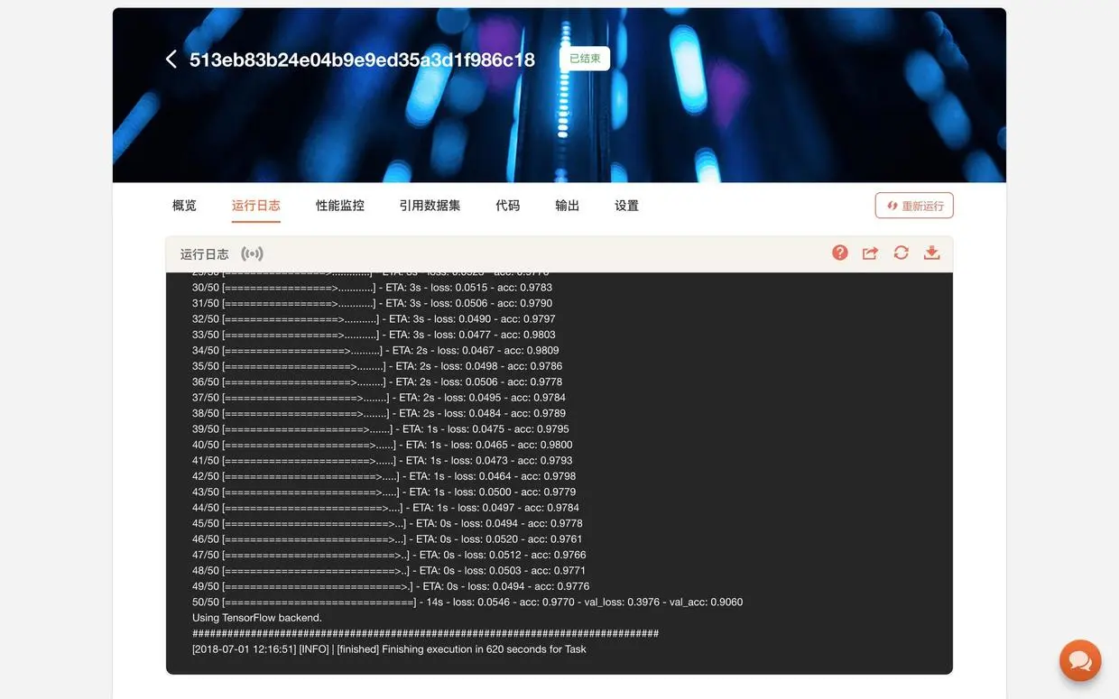 其次,屏幕输出内容过多的时候(例如我跑了 100 个 epoch, 每个显示 100 条训练进度),“运行日志”网页上模拟终端往下拉,就容易出现不响应的情况。变通的方法,是直接下载 log 文件,阅读和分析。